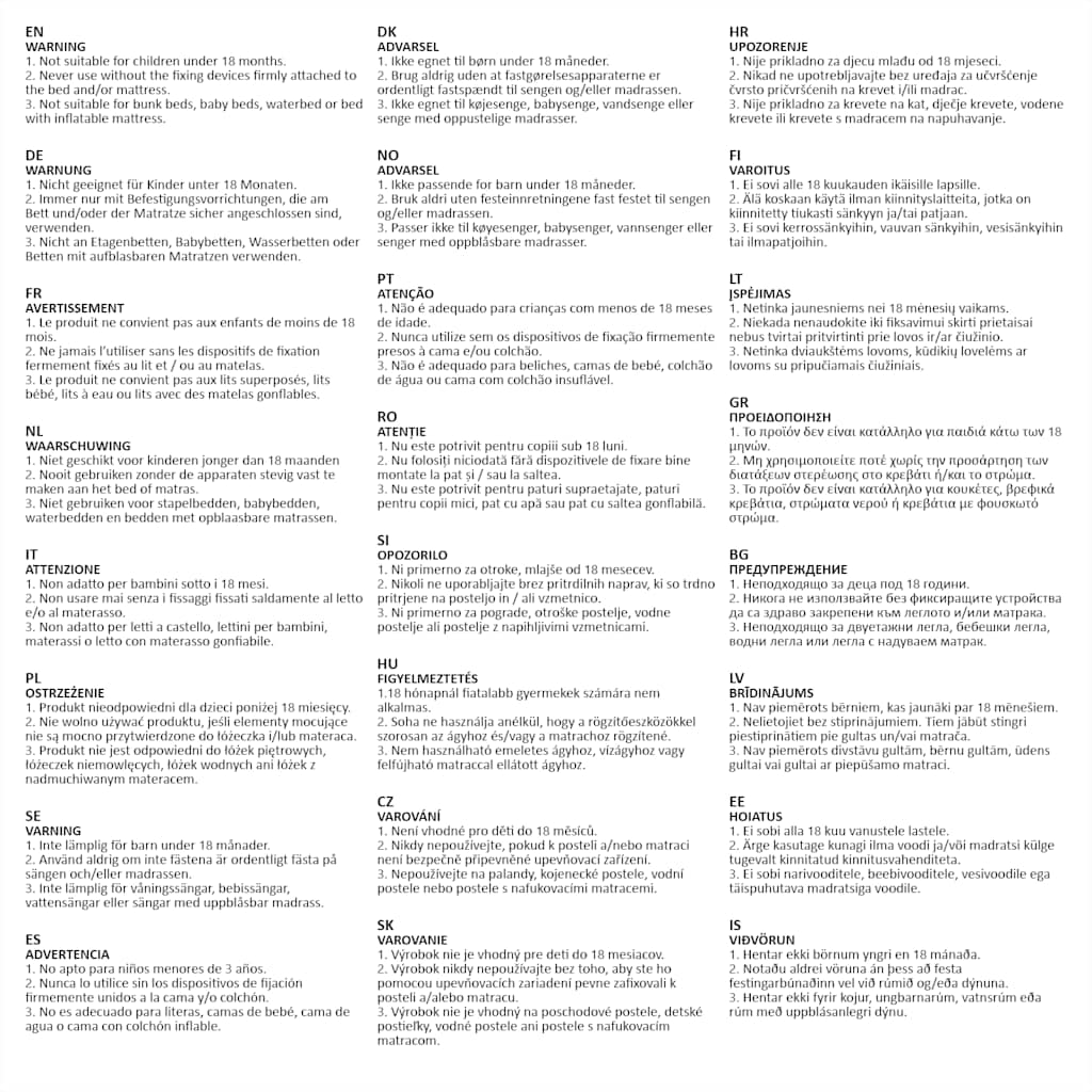 Det anbefales ikke at bruge sengehesten til børn under 18 måneder, eller når barnet er over 5 år. Sengehesten er ikke velegnet til brug af ældre eller svagelige voksne eller til brug uden for private hjem; Følg producentens anvisninger om størrelsen af seng og madras, som sengehesten er egnet til.
