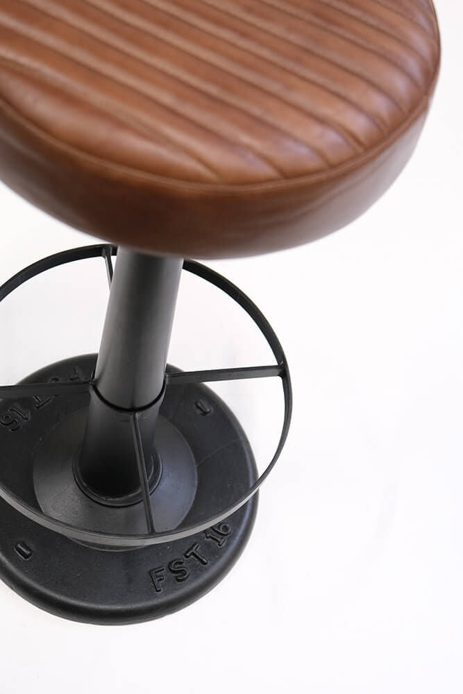 Denne barstol med drejefunktion kombinerer funktionalitet og et råt udtryk. Sædet er betrukket med brunt quiltet læder, der tilføjer både komfort og et maskulint look. Det sorte metalstel er robust og afsluttet med en solid fod, der giver stabilitet og industriel charme. Den indbyggede fodstøtte sikrer ekstra komfort, og drejefunktionen gør stolen ideel til både barer, restauranten og caféer, hvor fleksibilitet og stil er i højsædet.