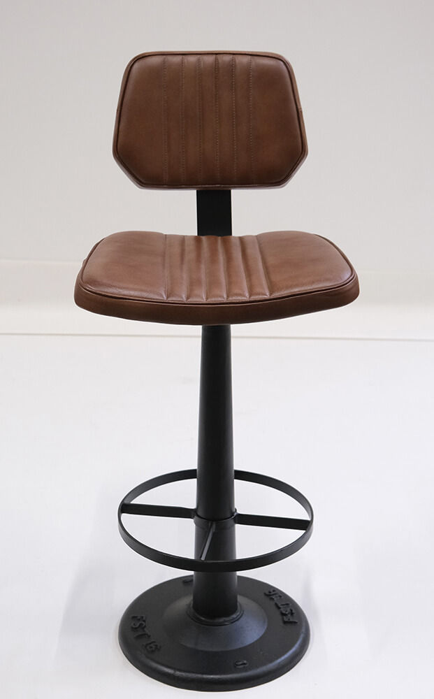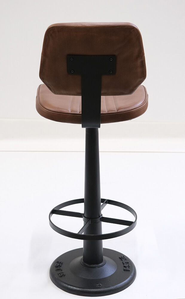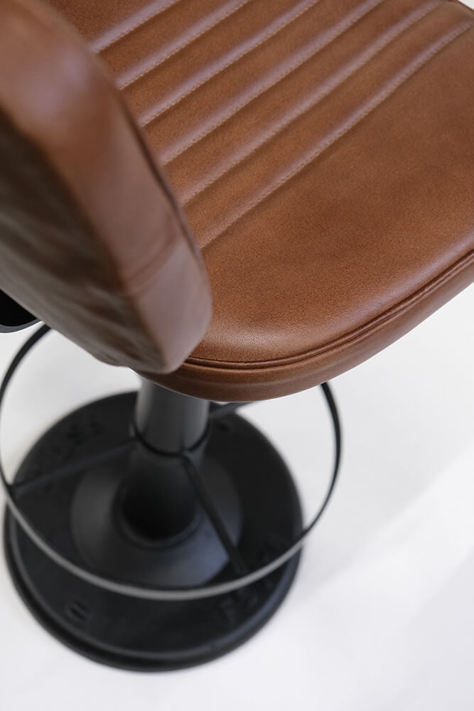 Denne barstol med ryglæn og drejefunktion er en rå og funktionel løsning i enhver indretning. Sædet og ryglænet er betrukket med brunt quiltet læder, der tilføjer komfort og et maskulint, industrielt udtryk. Stellet i sort metal har en solid base med fodstøtte, hvilket giver både stabilitet og totalt afslapning ved anvendelse. Drejefunktionen gør stolen ideel til fleksibel brug ved barer, restauranter eller højborde.