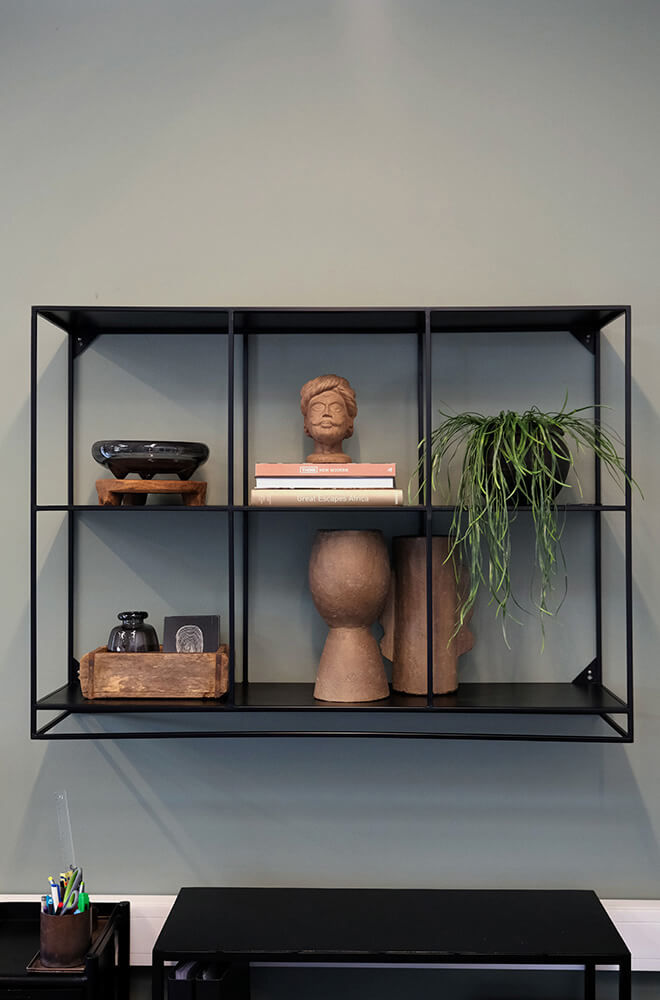 Enkel og minimalistisk vægreol i sortlakeret metal. Denne Washington vægreol giver med sine 2 gennemgående hylder samt 1 tophylde og 6 opdelte rum, rig mulighed for opbevaringen eller udstilling. Med reolen følger vægbeslag, så reolen kan hænges op, men reolen kan ligeledes stå stabilt på gulvet. Washingtons minimalistiske design sikrer, at øjet har fuld fokus på de bøger, vaser eller nips, som du vælger at have til at stå på reolen. Denne reol findes i fire andre udgaver. Søg efter Washington i søgefeltet. Afstanden mellem hylderne er 39 cm.