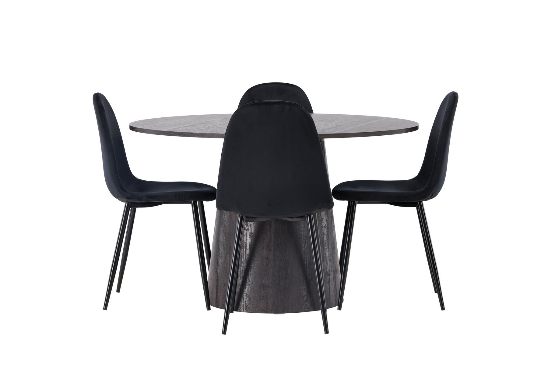 Here, no one ends up on the edge! Our wonderful, round dining table Lanzo has an overall design in brown MDF with a thin top and a twisted cylindrical frame that is centered under the table. Here in stylish combination with black dining chairs from the Polar series. The chair has a fully upholstered design, legs in black powder coated metal and rounded back and seat in black velvet fabric with soft padding. Gather loved ones for pleasant meals! Table diameter: 120cm.
