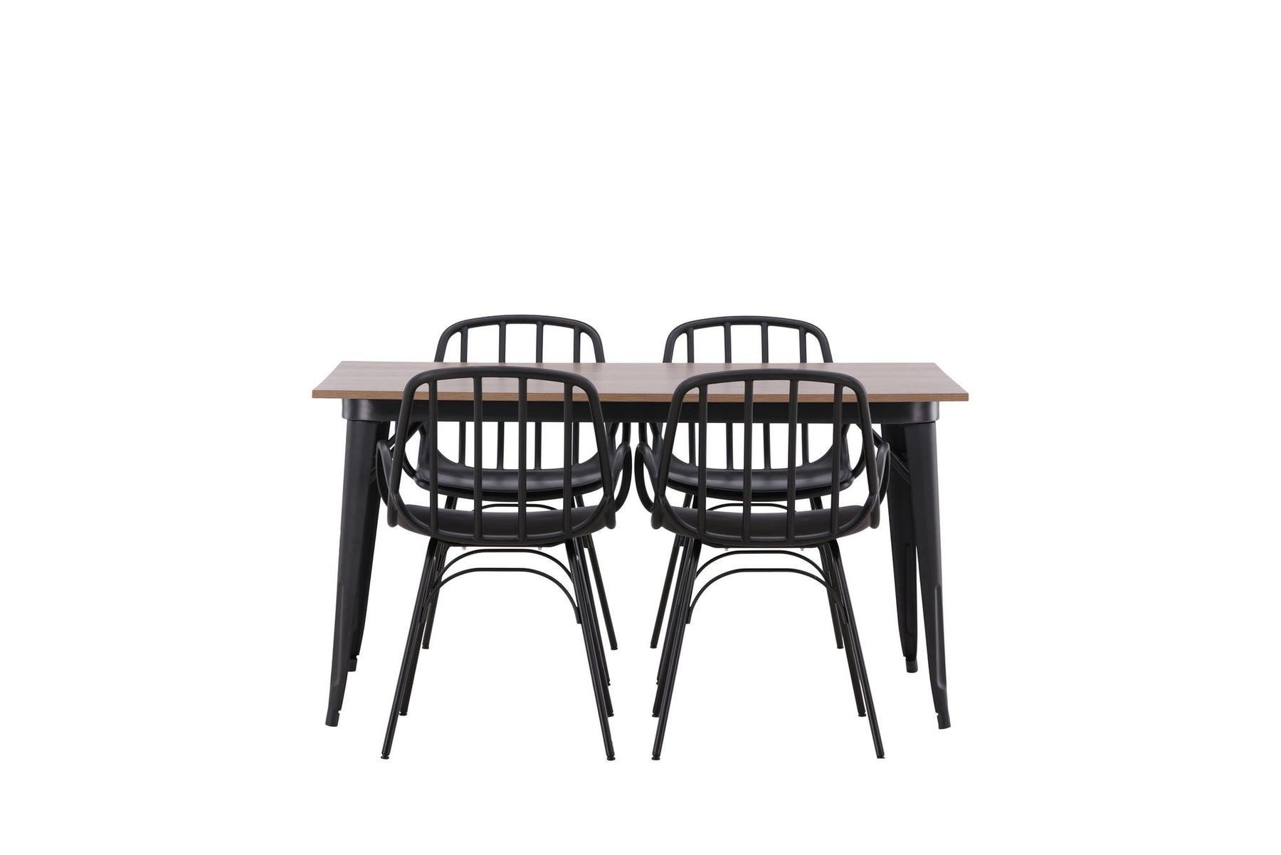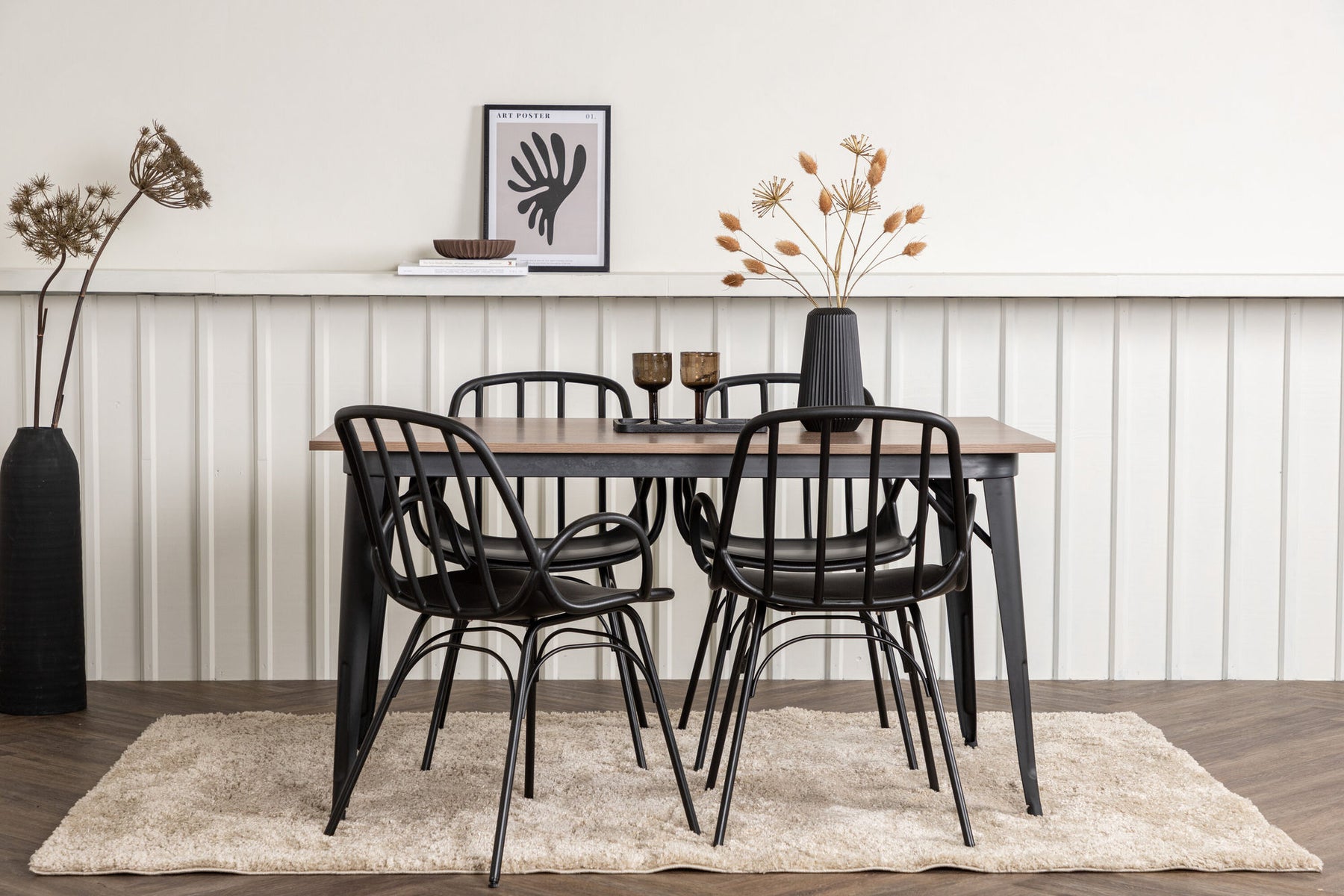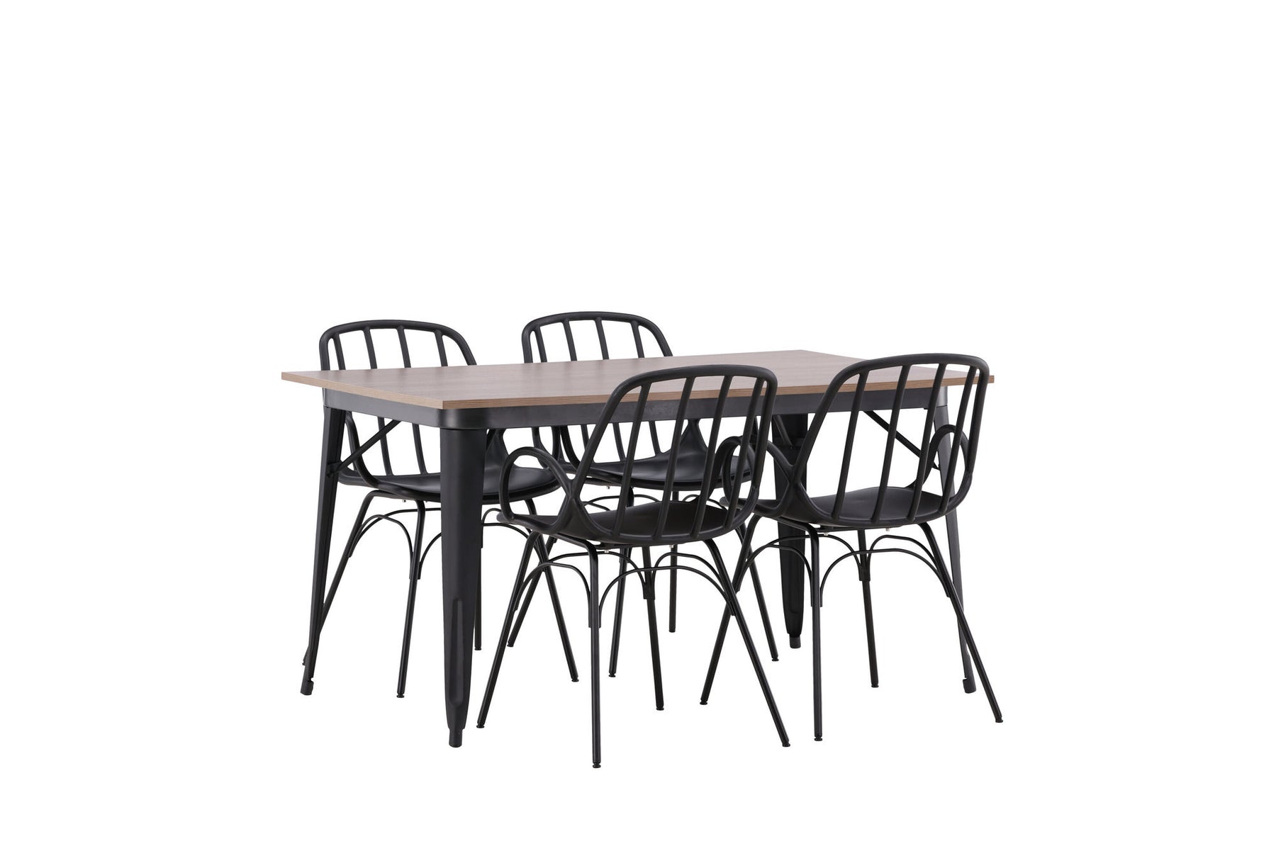 A dining group that exudes modernity and Nordic design! The dining table from the Tempe series is both trend-proof and durable. Made with a rectangular table top in brown MDF and table legs in black metal. Here together with our popular dining chairs from the series Dyrön. The chair is as stylish as it is practical, made of black plastic and steel. The seat has integrated armrests and a ribbed design in the slightly rounded back. Furnish the heart of the home invitingly and create a pleasant atmosphere!