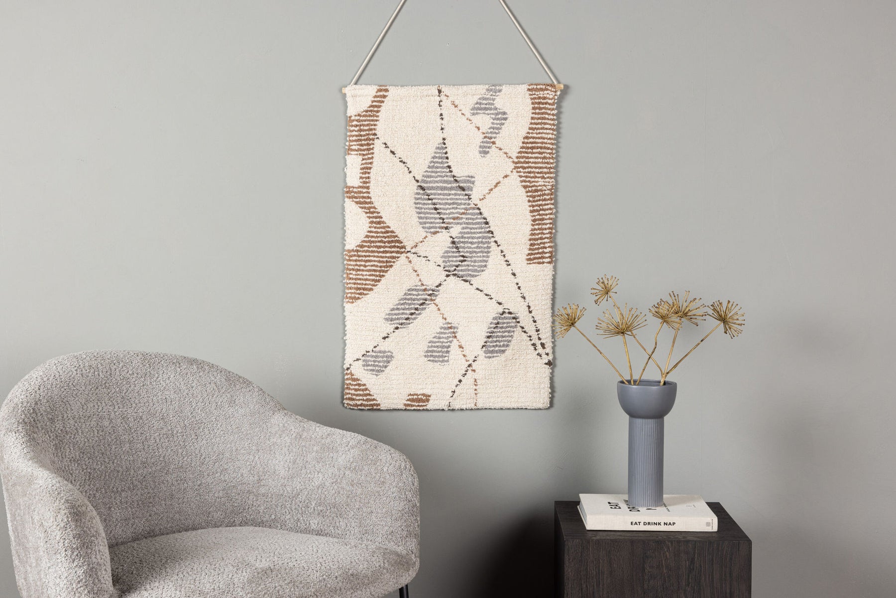Create a warm and inviting atmosphere in your room with our wall mat Liam. This beautiful mat is made of cotton and comes in elegant colors like gray, brown, and ivory. The patterned design on the mat gives it a unique and lively character that will be the perfect finishing touch to your interior project.