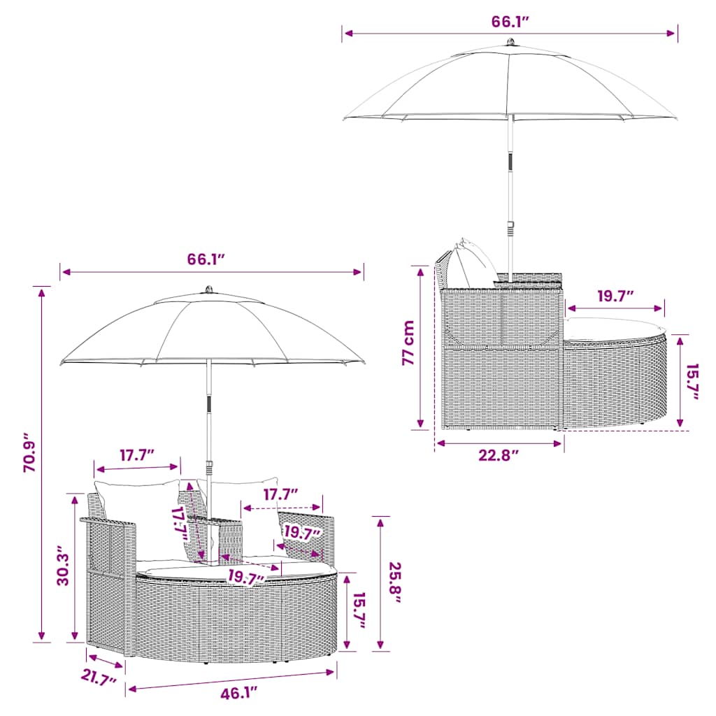 Takket være den vandafvisende polyrattan er sofasættet let at rengøre, slidstærkt og velegnet til daglig brug. Sættet har et robust stålstel, som er meget holdbart og stabilt. Den UV-resistente parasol er designet til at blokere for skadelige UV-stråler. Fodskamlen kan også afmonteres efter behov. De tykke, aftagelige hynder med skumfyld giver ultimativ sidde- og liggekomfort. Hyndebetrækket kan tages af og vaskes