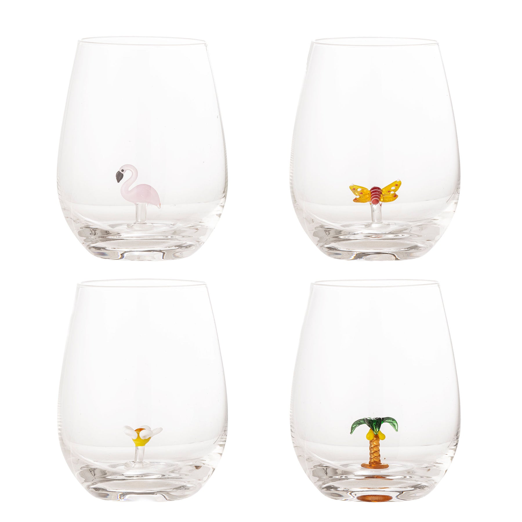 Misa Drikkeglassene fra Bloomingville er et sæt af fire smukt udformede glas, hver dekoreret med en unik, håndlavet figur i bunden. Figurerne inkluderer en flamingo, en sommerfugl, en blomst og en palme, der hver tilføjer et legende og personligt præg til din servering. De håndlavede detaljer gør hvert glas helt unikt.
