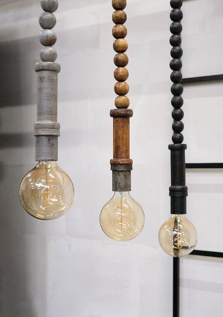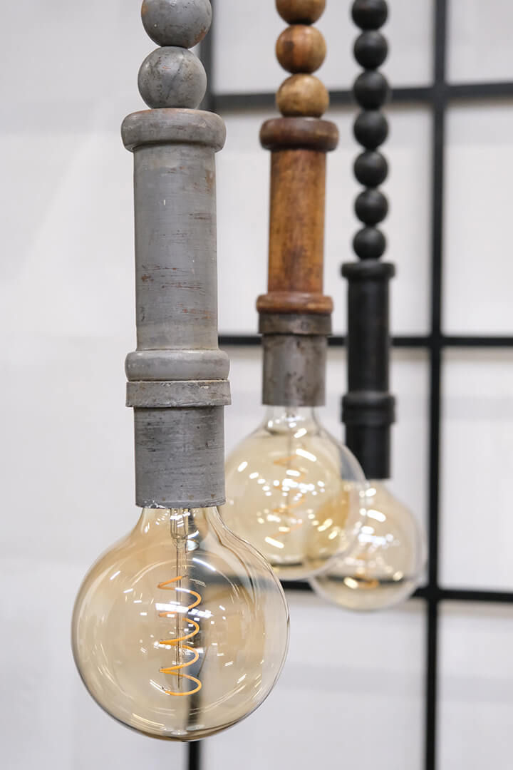 Dekorativ og skulpturel loftslampe fremstillet i antik gråfarvede trækugler. Fatningen er monteret i et lille stykke jernrør for enden af kuglerækken. En sjov og anderledes lampe som vil være et flot blikfang i din bolig eller i din butiksindretning. Lampen findes i 3 forskellige farver. Natur, antiksorte og antikgrå. Hæng dem enkeltvis, flere sammen i samme farve eller et mix af de tre forskellige farver. Lampen vil være smuk hvis du vælger en af vores flotte og eksklusive håndlavede LED-pærer med en iøjefaldende glødetrådsstruktur. Du kan finde et bredt udvalg af pærer her i webshoppen.