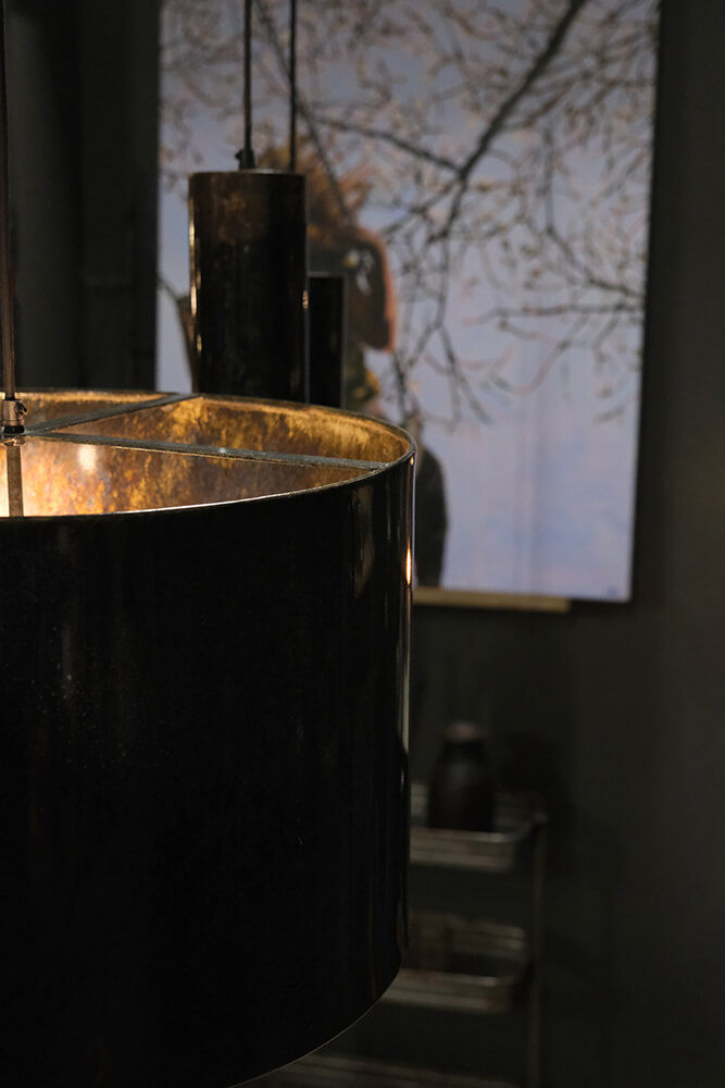Jonah loftslampe i jern med en mørkeblå marmorering i en flot enkel og lineær form. Lyset reflekteres enten nedad eller opad og spreder en rå og industriel stemning, uanset hvilket rum den lyser op. Lampen har en sort stofledning, der giver et stilrent touch.