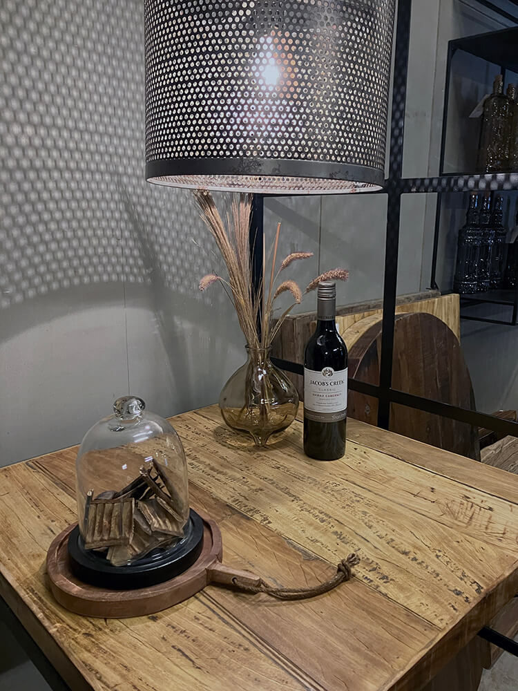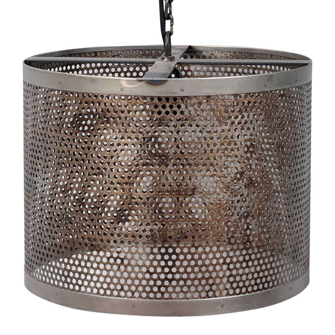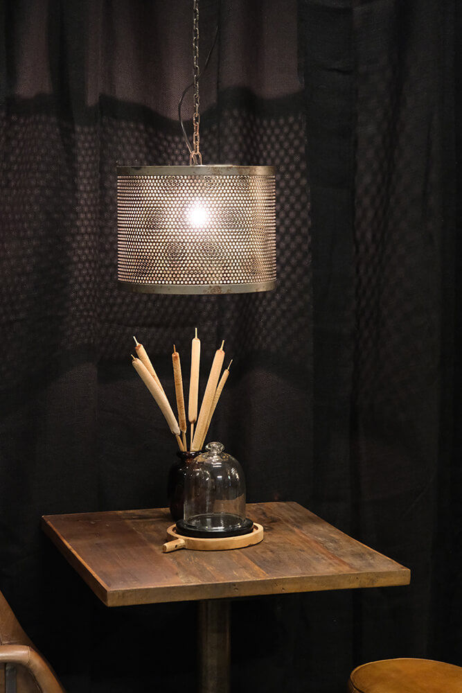 Kelly tager pusten fra de fleste. Den rustikke jernlampes patinerede og perforerede skærm, spreder en rå og industriel stemning, uanset hvilket rum den lyser op. En jernkæde er fastgjort til den patinerede lampeskærm og baldakin, hvilket tilfører lampen et yderligere rustikt touch.