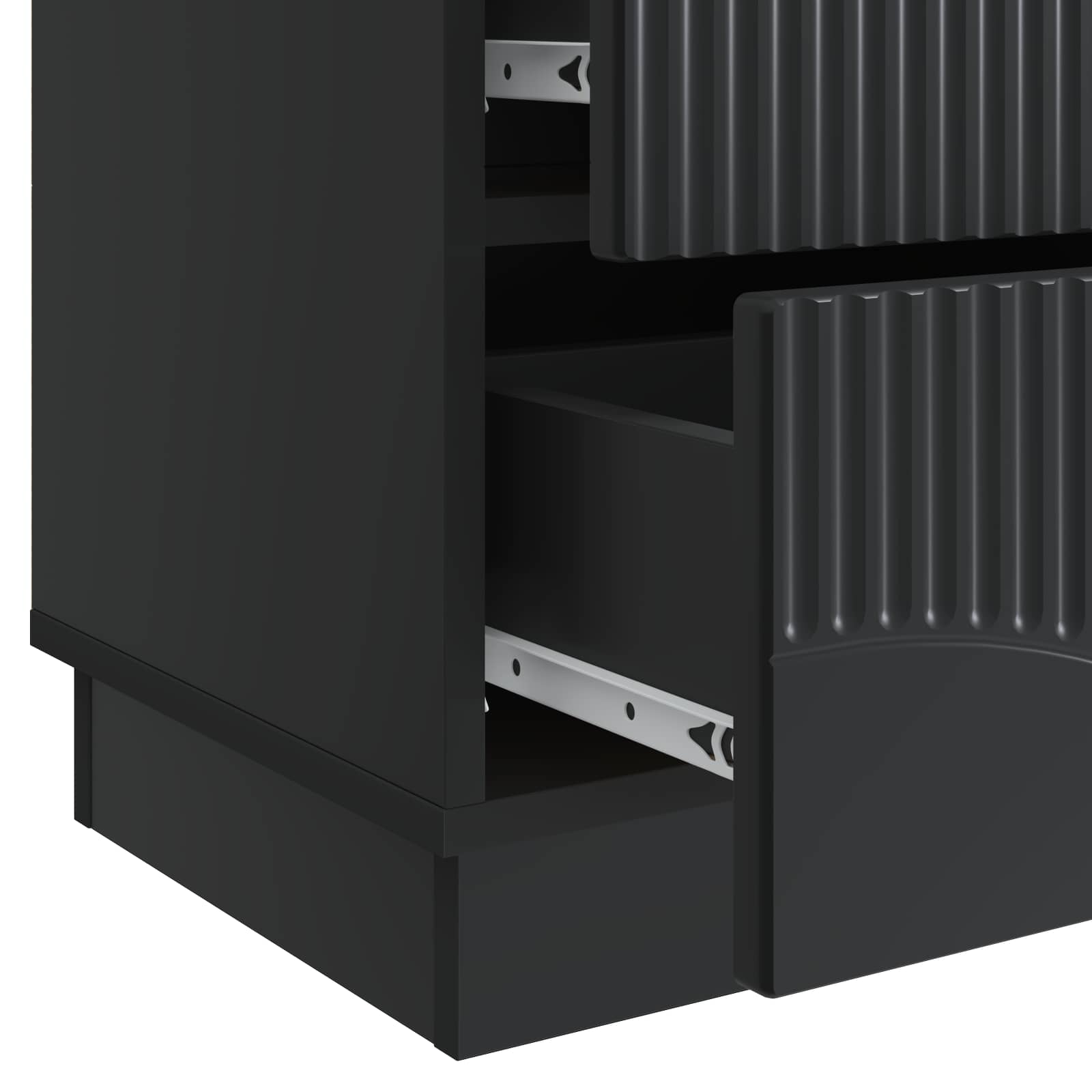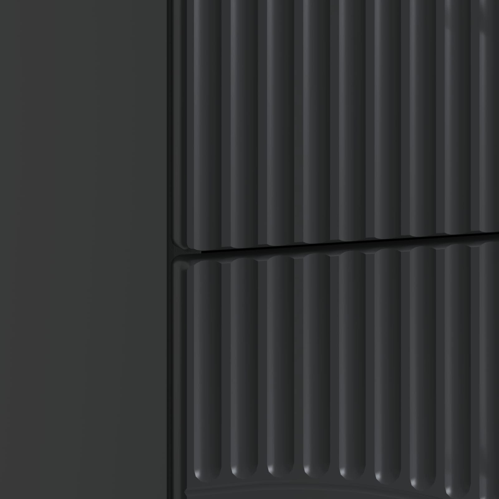 Inkluderede komponenter: Dette skab har stilige, lige barhåndtag, der tilfører et moderne touch. Med sine skuffer lavet i konstrueret træ, får du god opbevaringsplads, så alt er pænt organiseret og let at finde.