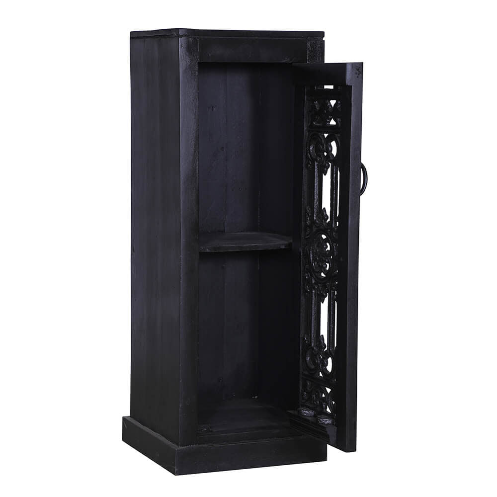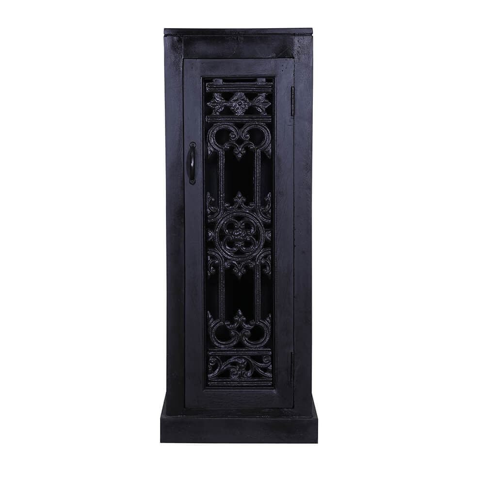 Utroligt smukt sort vægskab med støbejernsgitter. Det detaljerede støbejernsgitter i lågen tilføjer en rustik og karakterfuld dimension til din indretning. Samtidig giver vægskabet en praktisk opbevaringsløsning. Hæng det på væggen og lad det blive et iøjnefaldende element. Uanset om vægskabet bruges til at vise dine yndlingsgenstande eller til opbevaring af dine mest værdifulde ejendele, vil dette vægskab med støbejernsgitter helt sikkert tilføre en flot og tidløs charme til din indretning.