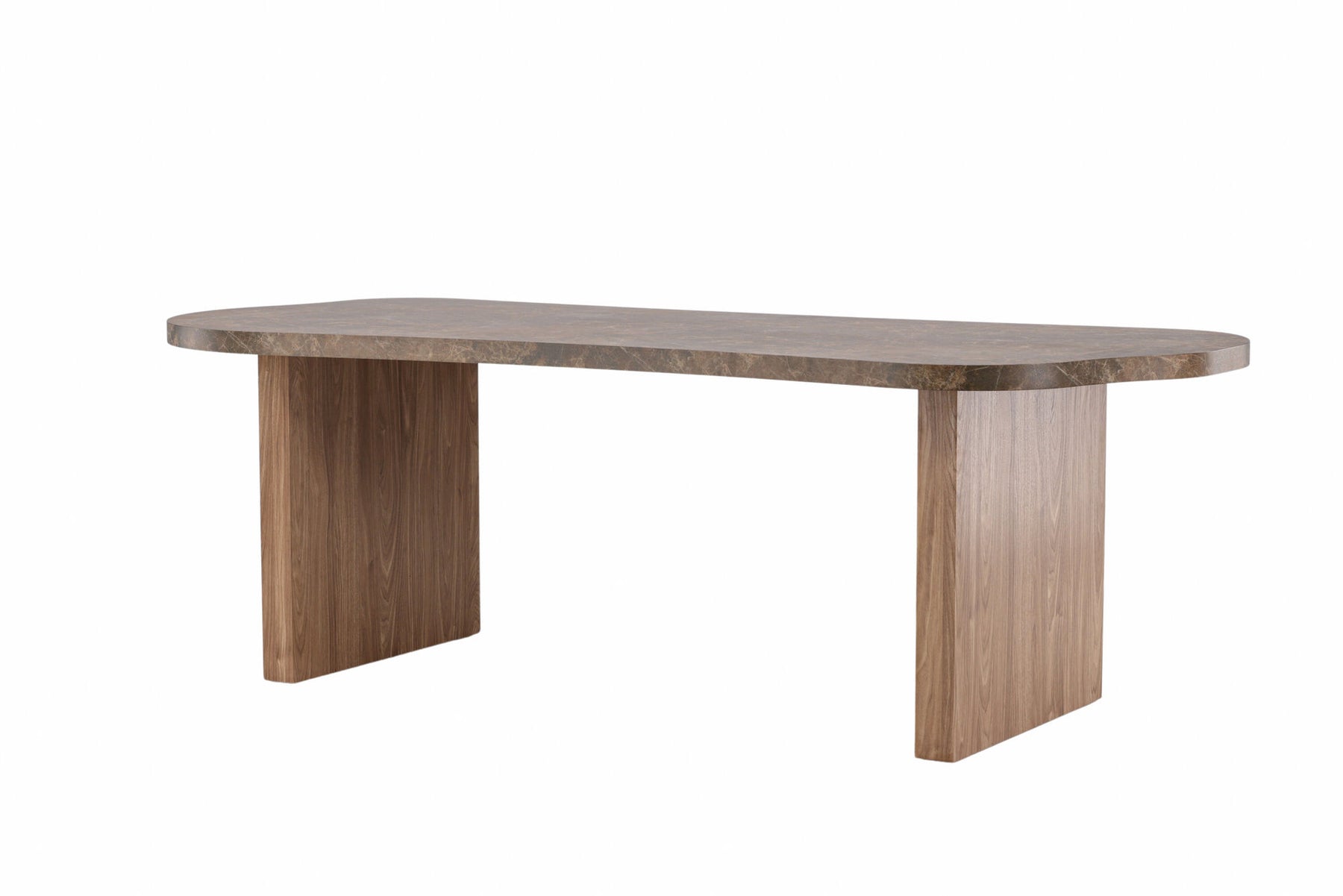 The Eleonora dining table features an enchanting brown marble look that exudes a sense of luxury and class. Its lighter legs provide a nice contrast and highlight its elegant design. Made of MDF material, this table offers stability for long-term use.