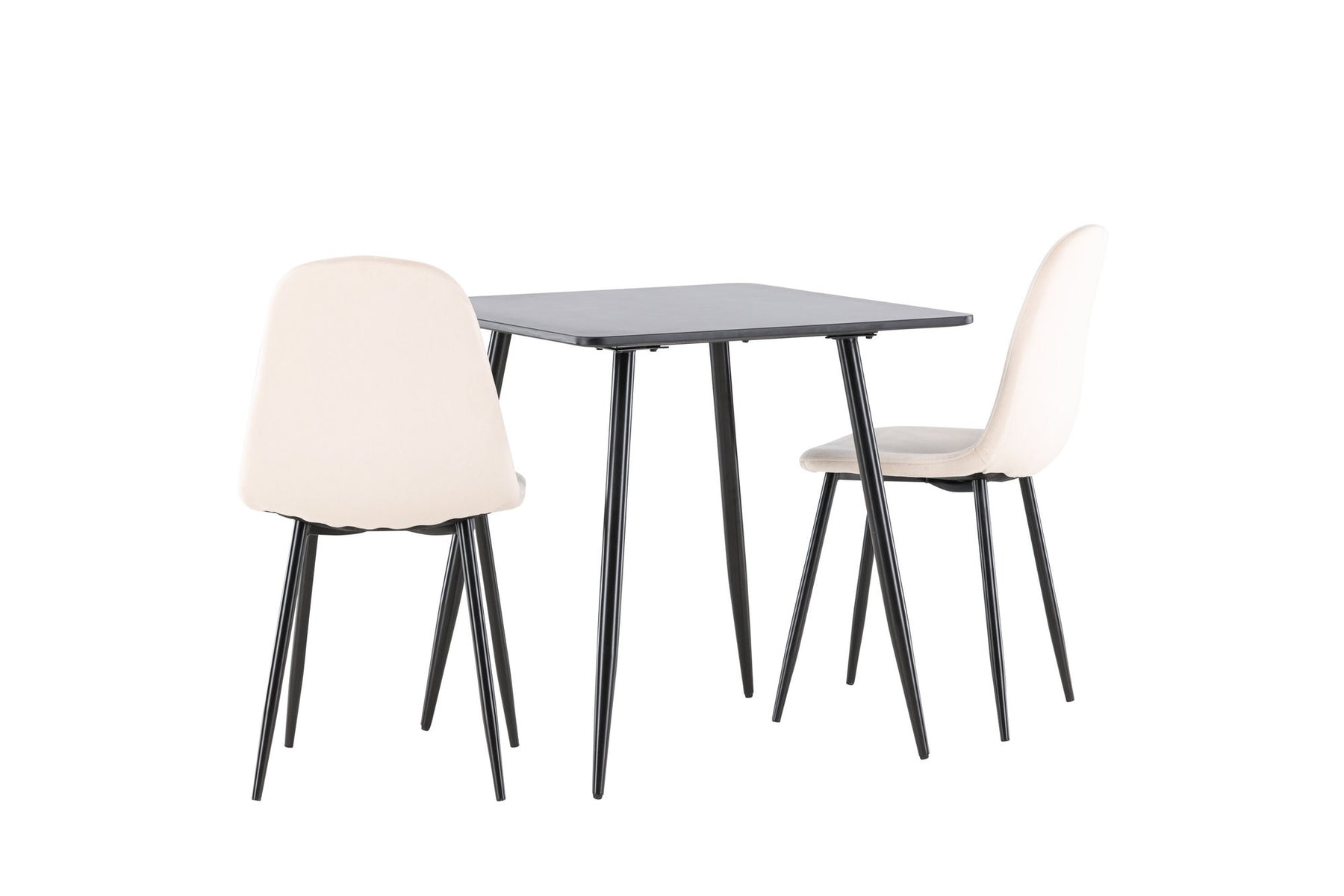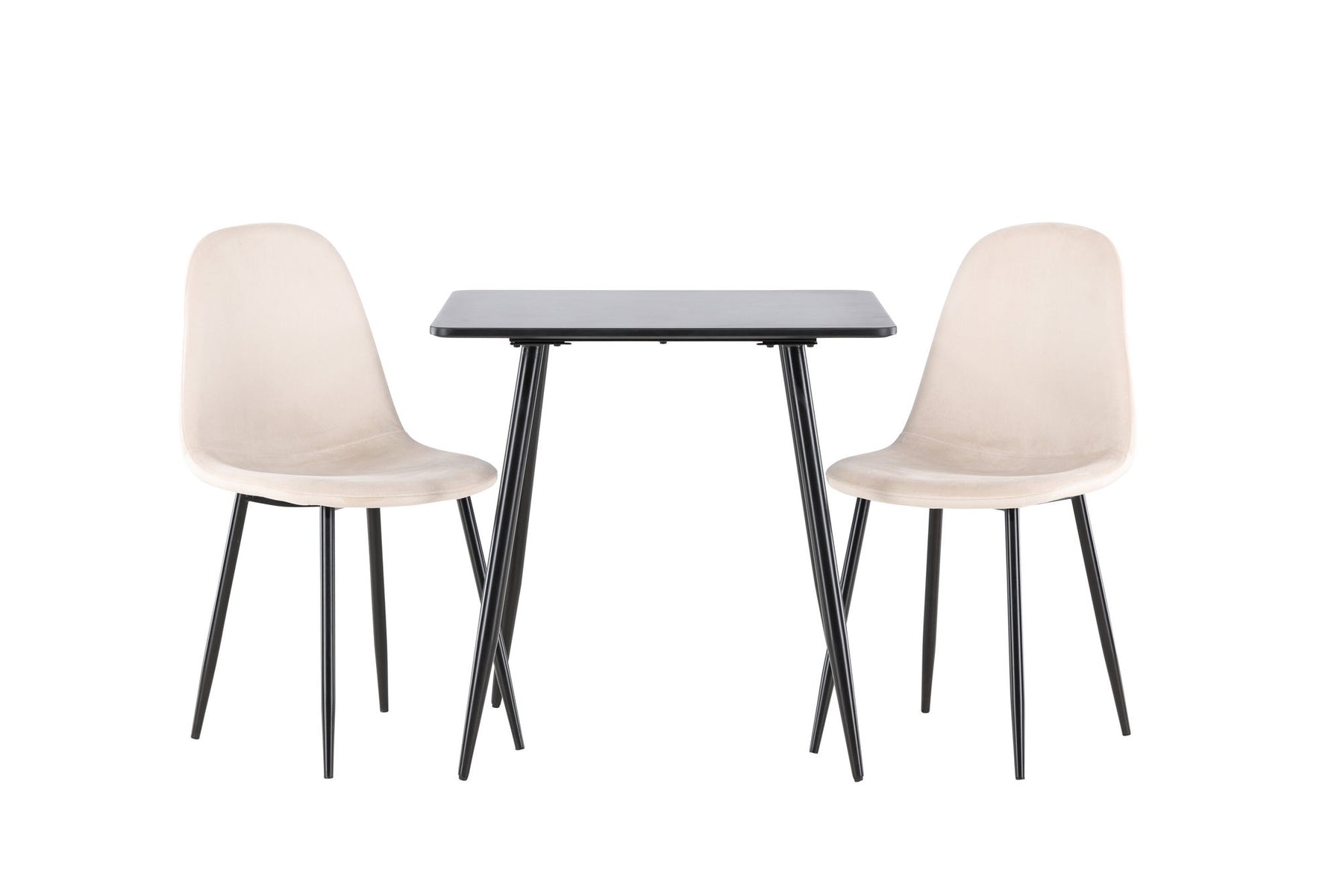 Create an elegant and inviting dining area with our stylish dining set that combines the modern Polar table with the luxurious Polar chairs. Perfect for both small meals and cozy dinners, this dining set gives your dining room or kitchen a sophisticated and harmonious atmosphere. The Polar dining table, made of MDF, has an elegant black color that adds a modern and sleek feel to your home. With dimensions of 75x75 cm, the table offers a compact yet spacious surface for food and conversation, making it ideal for smaller spaces or intimate dining areas. The table's robust construction ensures long-lasting use and stability. The two Polar chairs complement the table perfectly with their elegant seats upholstered in beige velvet. These chairs offer both comfort and style, making them ideal for long, enjoyable meals. Their modern design with high backrests and soft seats gives your dining room or kitchen a sophisticated and contemporary touch. This dining set is a perfect combination of aesthetics and functionality, making it an excellent choice for those seeking an elegant and comfortable dining area in a smaller format. Upgrade your home with the combination of the Polar table and Polar chairs, and create a place where memories and joy are shared.